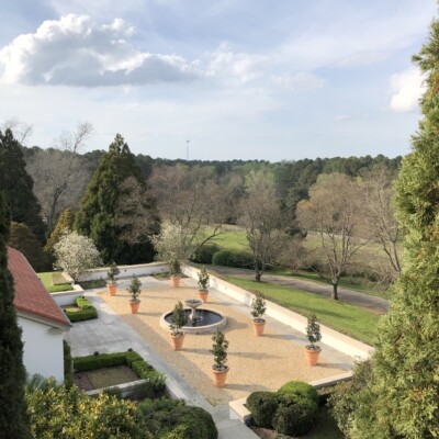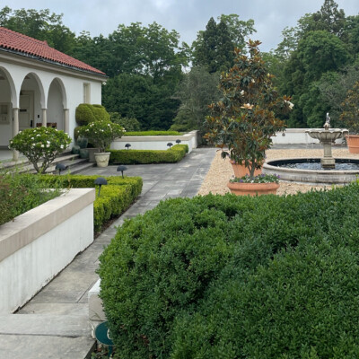 - Boxwood (Buxus microphylla ‘Curly Locks’) espaliers on interior wall of pool terrace. Planted by Alice Hand Callaway, 1972.