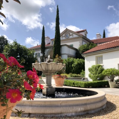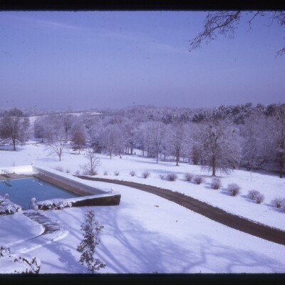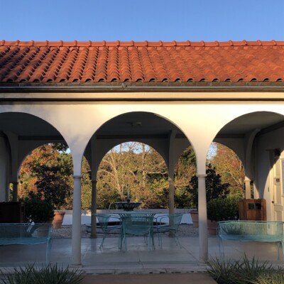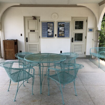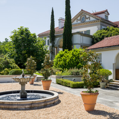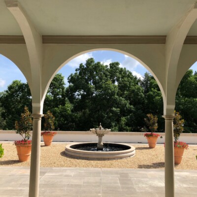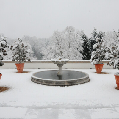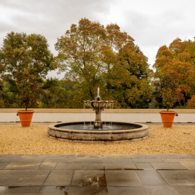 When the estate was opened to the public in 2004, the pool was filled in because of insurance liability and a fountain framed by eight terracotta pots containing ornamental plantings was added. The pool is filled with loose pea gravel which could feasibly be removed in order to restore this area back to a swimming pool. It is always preferred that changes to a historical site be reversible if at all possible, even though the alterations may be deemed necessary at the time they are done, as this would greatly facilitate the possibility of future restoration to the original appearance. The limestone edge that was the pool’s border is still visible.