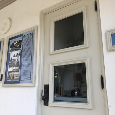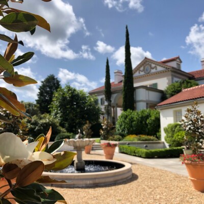 The bathhouse, planned by architect Hill Huffman of Atlanta, GA, in August 1940, was designed to complement the Italian villa style of the house. On each side are men and women stalls for changing clothes, as well as shower and bathroom facilities. A kitchenette was also installed. On the back walls of the bathhouse are espaliered ‘Curly Locks’ boxwood — another of Alice Callaway’s creative garden treatments for these woody shrubs.