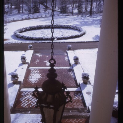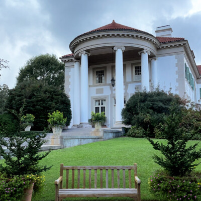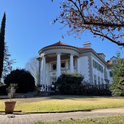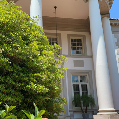 The East Portico is the front entrance of the Callaway home. The Italian-style villa was designed by Hal Hentz and Neel Reid to complement the terraced gardens created by Sarah Ferrell. Six large wooden columns with Ionic caps support the semicircular terracotta roof that covers the portico. The diamond-shaped marble plaque above the doorway is inscribed “1916,” the year the home was completed.