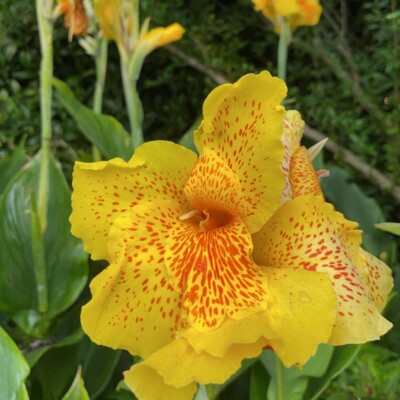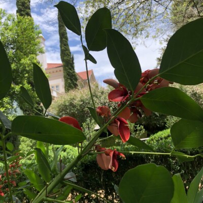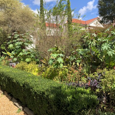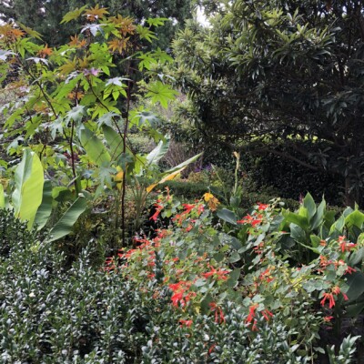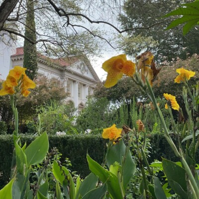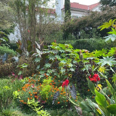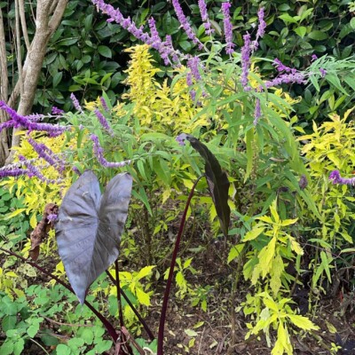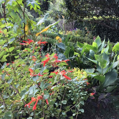 - Center section: heirloom canna lily (Canna ‘Yellow King Humbert’) planted by Alice Callaway, loquat (Eriobotrya japonica), castor bean (Ricinus communis), species of banana (Musa) or banana relatives (Ensete), Mexican bush sage (Salvia leuchantha). These tropicals have a history of being grown by either Sarah, Ida, or Alice.