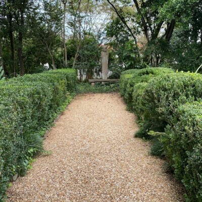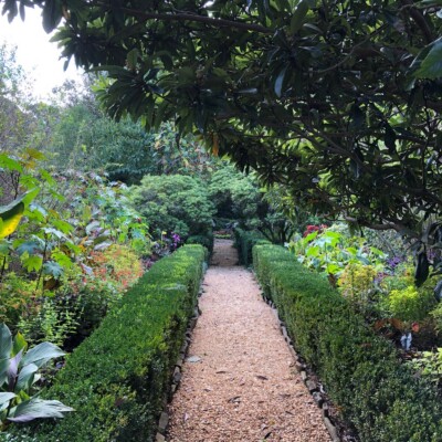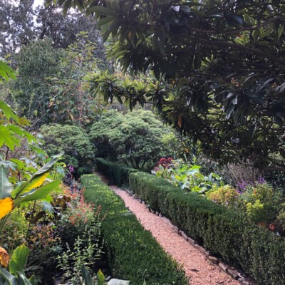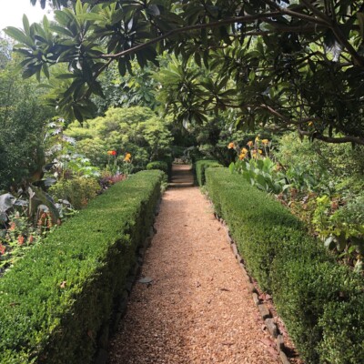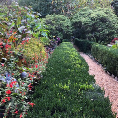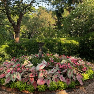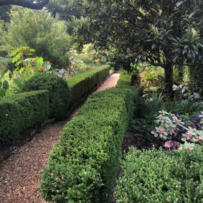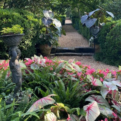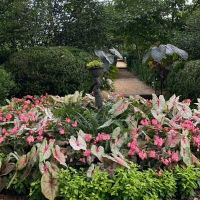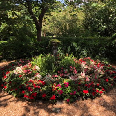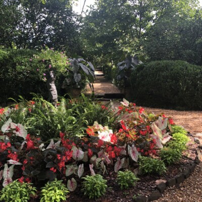 Dubbed the Florida Garden by Ida Callaway, the beds flanking this path just up from the herb garden got the name because of the tropical and marginally hardy plant material she acquired on trips down to Florida and subsequently brought back to plant here. Alice Callaway later modified the name to Florida Lane and continued to use plants here that would lend a tropical feel to this section. In late winter, the beds are in bloom with narcissus and Spanish bluebells, but during the warmer months of the growing season, they are still filled with tropical and exotic plants, perpetuating the theme begun years ago.