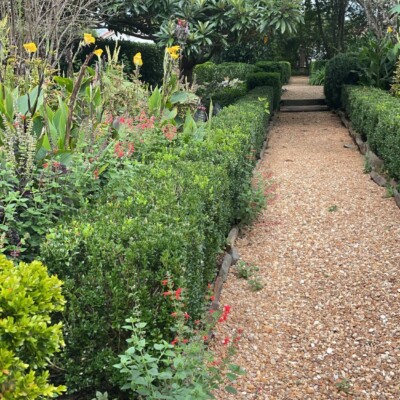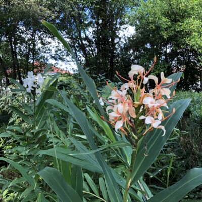 - Northern-most section: Variegated Chinese privet (Ligustrum sinense ‘Variegata’) flanks each side of the path that dissects the lane, Cockspur coral tree (Erythrina crista-galli), pink crepe myrtle (Lagerstroemia sp.), nandina (N. domestic), and ginger lily (Hedychium) were all grown by Alice Callaway.