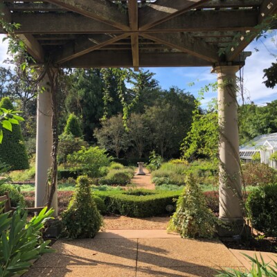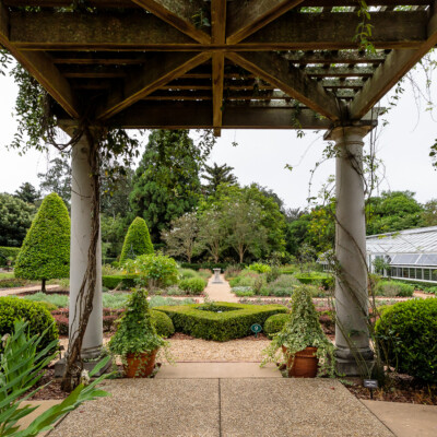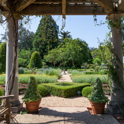 The arbor that overlooks the Herb Garden is based on an original Neel Reid design and was added in 2004. The original design was done for Fuller Sr. and Ida, but was never installed in the garden. The only change to that design was making the columns a little taller they were originally drafted to be. The arbor is draped with heirloom climbing roses and cross vines.