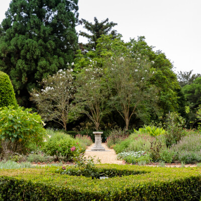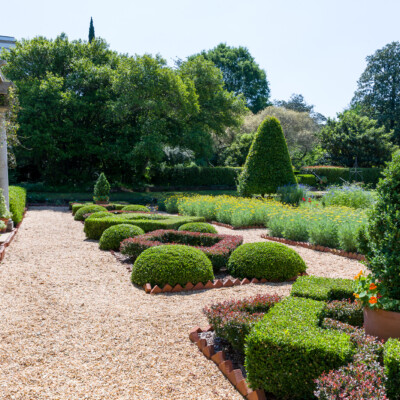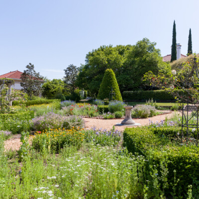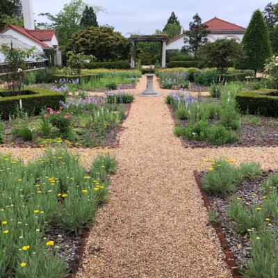 The four main quadrants in this garden contain most of the herbs. In the center of each of these beds is a pillar supporting an antique climbing rose planted in memory of the old rose garden that Ida and Fuller Sr. once enjoyed. Also, notice the evergreen cherry laurel topiaries which add a formal element to the design. Before pea gravel was added, small boxwood and brick outlined the paths.