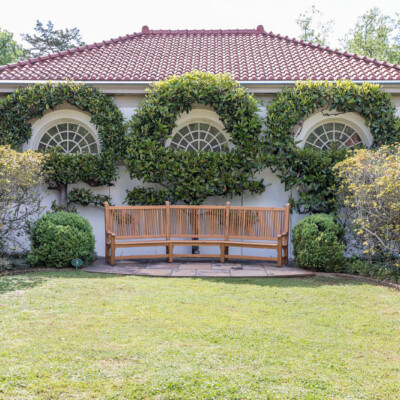 The Magnolia Espalier is one of Alice Callaway’s unique garden treatments—three southern magnolias are espaliered, or trained to grow flat, against the east side of the original 1916 garage. This is an unusual treatment for such a large tree, and one that is admired by gardeners who pass this way. Although the magnolia does not bloom because of the many prunings necessary to maintain its shape, it softens the garage wall as Alice desired and is just one of the many ideas she introduced to the garden.