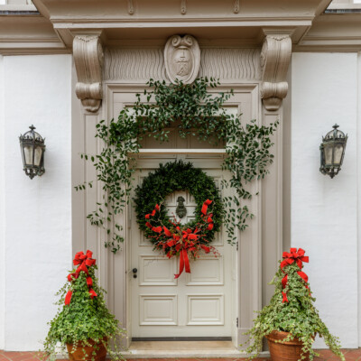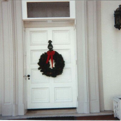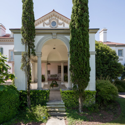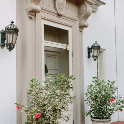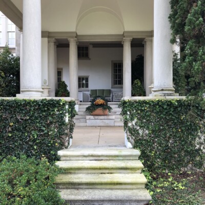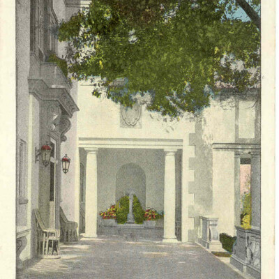 The Porte Cochere is a sheltered entrance to the home that was especially convenient during inclement weather. Porte Cochere is a French term that literally means “coach door.” Architecturally, it is a covered entrance large enough for vehicles to pass through and that, historically, enters into a courtyard. Note the large carriage step at the bottom of the stairs. As family and guests arrived, the horse and carriage or automobile would stop beside the carriage step so that passengers could easily disembark onto it. It is the same height as mounting steps on carriages or running boards on early twentieth-century autos. The home’s north terrace extends under the covered portion, creating a shady porch that features a small fountain (no longer functional) and wicker furniture for enjoying the fresh air in warm weather. Also note the beautiful cast-stone columns and vaulted ceiling.