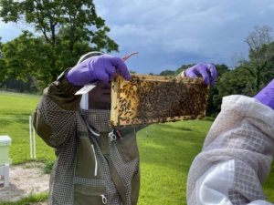 Fast forward to the present when, inspired by Fuller’s prior efforts and coupled with a desire to re-connect to the agricultural roots of the property, we jumped at the opportunity to bring honey bees back. Thanks to the volunteer efforts of Dick and Sydney Daniel and Zachary Taylor, an apiary was recently reintroduced on our grounds. Guests that take the tram from the Visitor Center up to the house and garden can now see a line of pastel-colored hives prominently standing on the terraced hill. Four colonies were initially established, captured either from swarms or hive splits within 2 miles of Hills and Dales. Ironically, a large colony was then relocated from a cutout performed at Elm City Mill, one of the earliest Callaway Mills. According to Dick: “The current mill owner saw the bees as a nuisance and wanted them removed, so we were happy to provide them a new home.” The latest came from one of the three trap boxes located on the estate. Right now, our hive count stands at six and, if all goes well, it will grow to twelve within the next year.