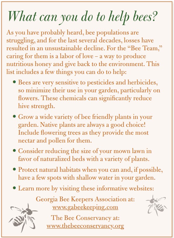 Most exciting of all, by the time you read this story, the Team will have completed the first honey collection, being careful to leave enough for the bees to use in the fall and winter months. According to Dick: “We are essentially encouraging them to make more honey and if there is excess above their winter needs, we can have a fine harvest. If all goes well, we could gather 100 pounds from a single robust hive.” According to Taylor: “The ultimate goal is to deliver Hills and Dales-branded honey just like Mr. Callaway did. After all, it’s locally produced, absolutely delicious, and is naturally organic. A win-win for everybody.”