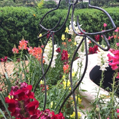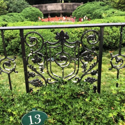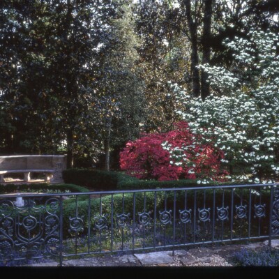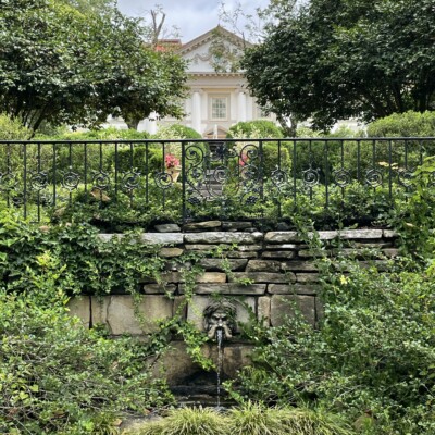 The view from this bench up to the terrace, house, and upper fountain is one of the most admired views in the garden. From this vantage point, one can also see another fountain shaped into a face mounted onto the stone wall under the railing on the terrace above. This fountain, along with the circular one and the bench were put in by Fuller Callaway Sr. in 1916. Behind the bench, the Ferrell’s iron fence and gates still close off this garden, extending out parallel on each side to the curved walls. The railing up on the 5th terrace and the handrails on the steps were installed by the Callaways. If you will notice, the railing has a grape motif.