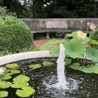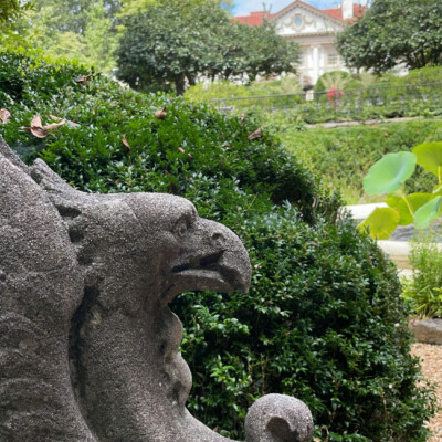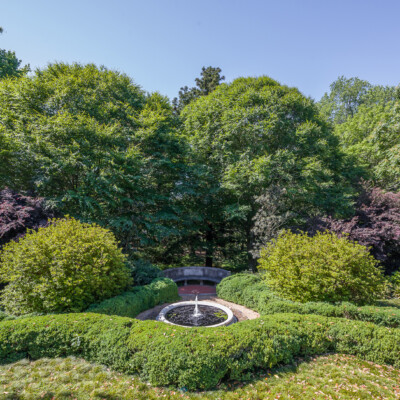 Stone steps on each side of the Sunken Garden lead down to a curved cast stone bench and fountain. Visitors often recognize the bench as the one used by Fuller Jr. and Alice during their courtship. A curved sofa in the living room of the house sits aligned with this bench in the garden. Alice had the sofa designed in the shape of the bench where she and Fuller fell in love. More information on this sofa can be found in our Portico article, “The Curved Garden Bench and a Unique Sofa.”