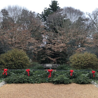 Sarah Ferrell designed the boxwood beds of this area, but she had them filled with a wide variety of different shrubs, trees, bulbs, and perennials. Alice called it “a Victorian hodgepodge.” Alice later simplified the plantings by using the mondo grass ground cover, trees, and shrubs that you see today.