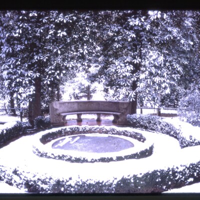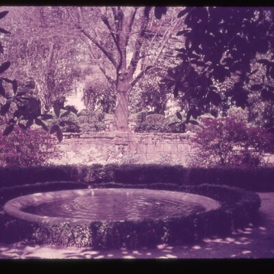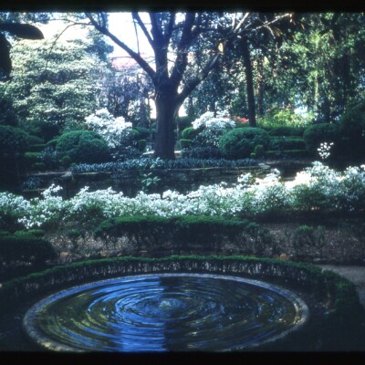 The Sunken Garden is the lowest portion of Mrs. Ferrell’s garden, comprising the 6th terrace. A historic stereoscope image of this area during the Ferrell era shows a summer house structure covering the area where the curved bench now sits and the circular bed is approximately where the pool and fountain are. Note the iron fence to the rear of this garden that is still extant.