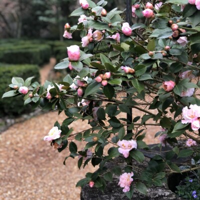 - Tea (Camellia sinensis) growing as a hedge atop the wall near the steps. Blooms white in October. This plant was cultivated by all three ladies: Sarah, Ida, and Alice. This hedge was planted by Alice Callaway.
